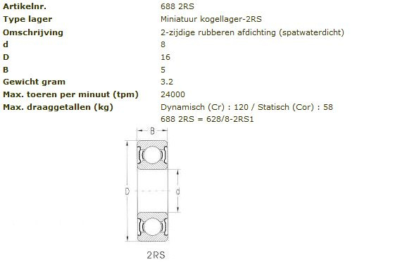 HKW SS628/8-2RS = SS688-2RS mini kogellager in RVS (INOX) met rubber spatwaterdichte afdichtingen.